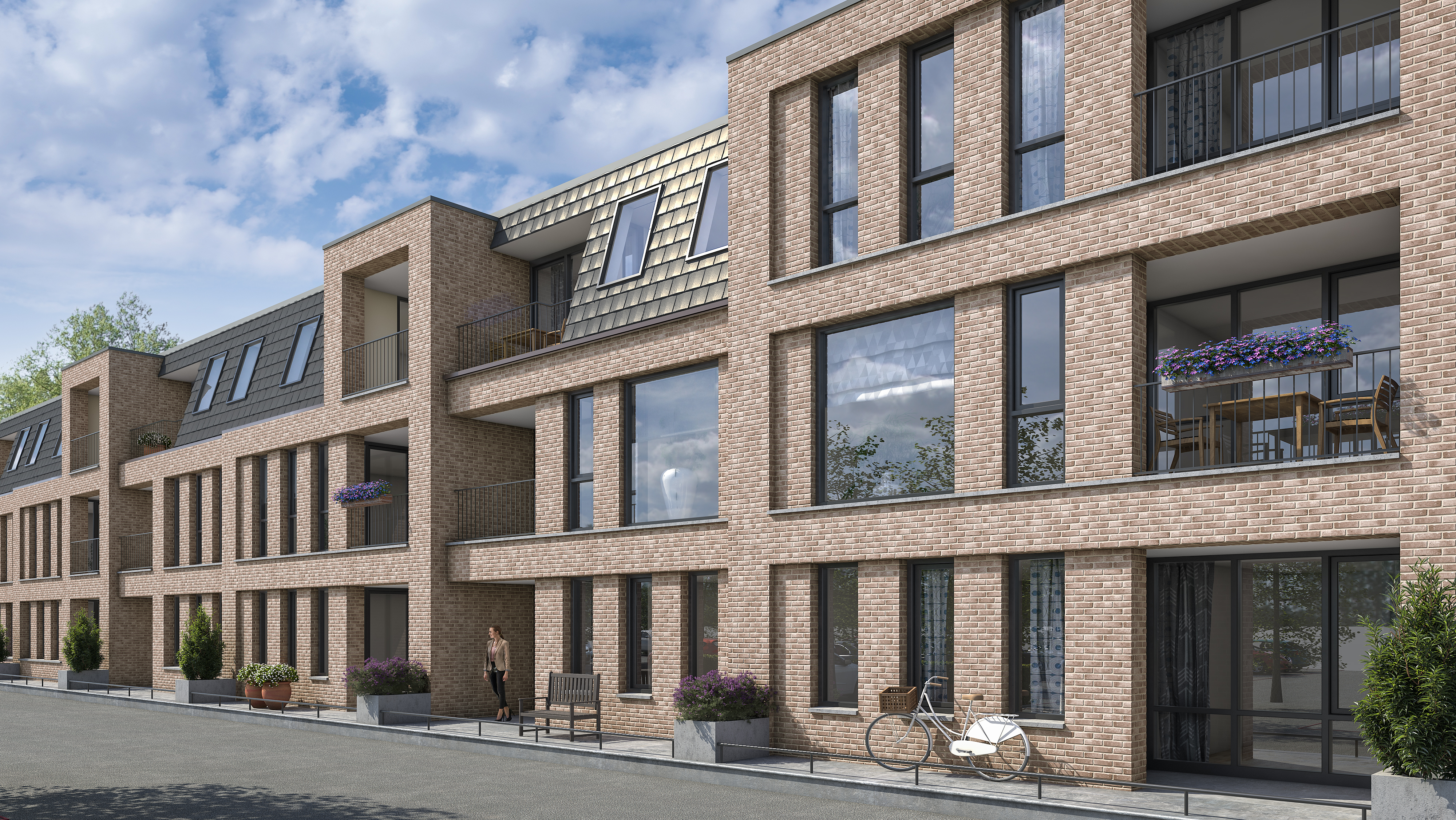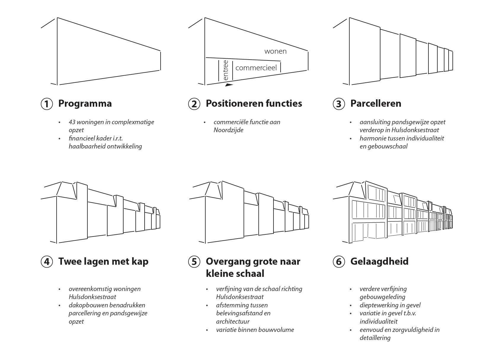 De functies zijn ingedeeld, passend bij de stedenbouwkundige ligging. De commerciële ruimte aan de noordzijde bij de grootschaligere bouwblokken en grotere zichtlijnen, de woningen aan de zijde van de Hulsdonksestraat. De gevel wordt middels dieptesprongen geparcelleerd, wat aansluiting geeft op het in het beeldkwaliteitsplan genoemde pandjesprincipe. De parcellering is zo vormgegeven dat deze de architectuur van het complex versterkt en juist geen fictieve nabootsing wordt van het pandjesprincipe verderop in de Hulsdonksestraat. In het gevelontwerp geeft een verloop van een grof naar fijn vervolgens de subtiele invulling aan het bijzondere stedenbouwkundige karakter van de locatie. De individuele woningen zijn afleesbaar doordat de verdiepte kaders met gevelopeningen afgestemd zijn op de achterliggende appartementgrootte. De verdiepingshoge gevelopeningen zullen het interieur extra cachet geven en daarmee de woonkwaliteit vergroten.